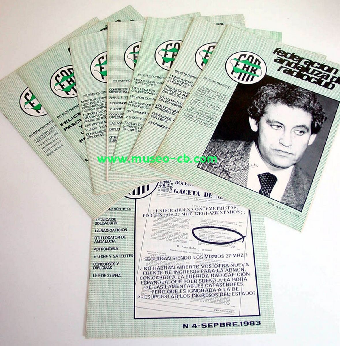 Revistas de la Federación Andaluza Radioclubs, de 1983. Boletines internos de noticias. En el número 0 aparece la fotografía del entonces presidente de al Junta de Andalucía, Rafaeel Escuredo.