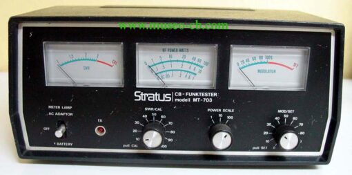 Medidor de 3 agujas, uno para SWR, otro para potencia y el tercero para modulación. Las tres agujas iluminadas a pilas o 9 volt externos. Posee un led de indicación TX Potencia máxima de 100 watios
