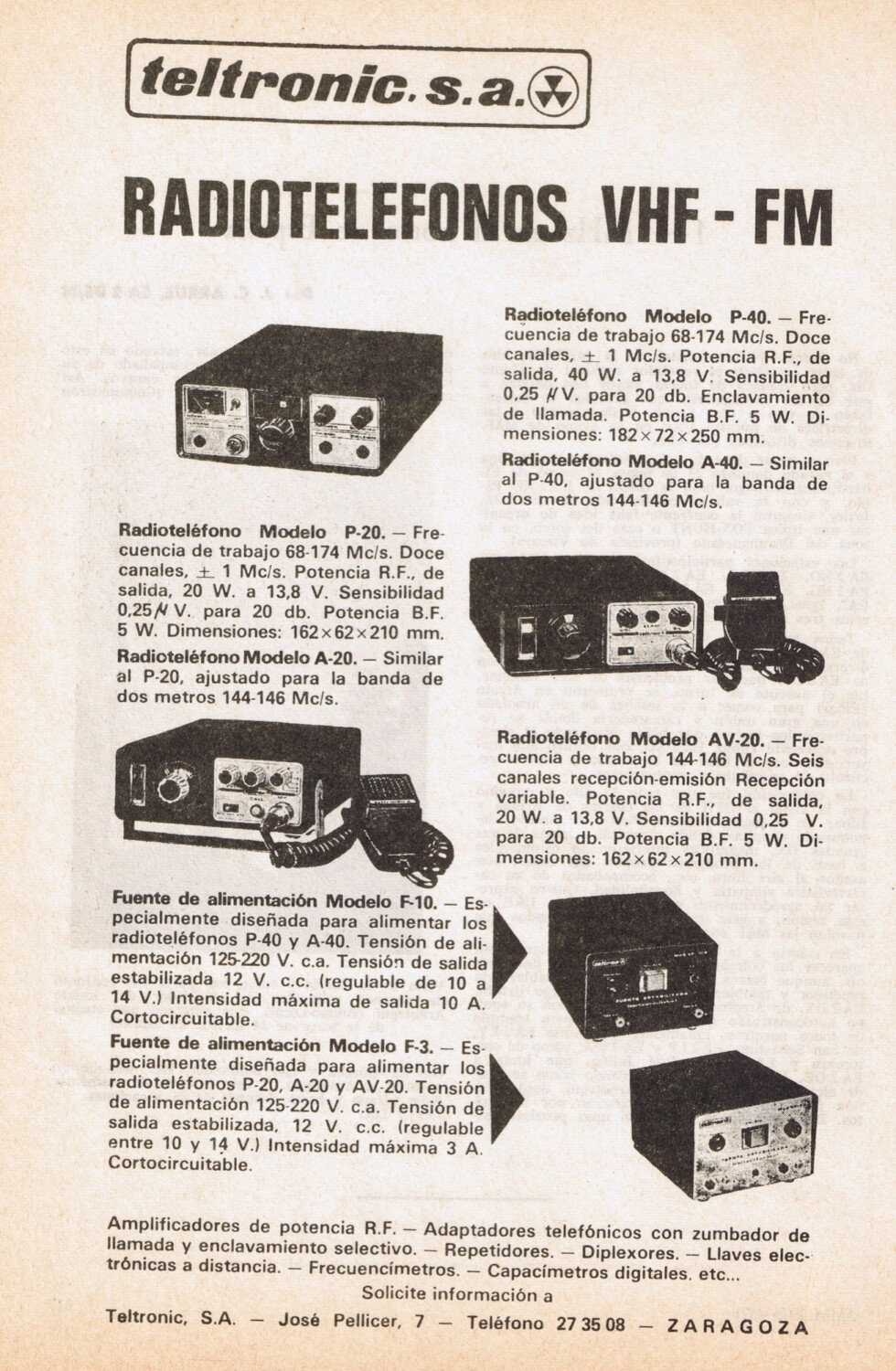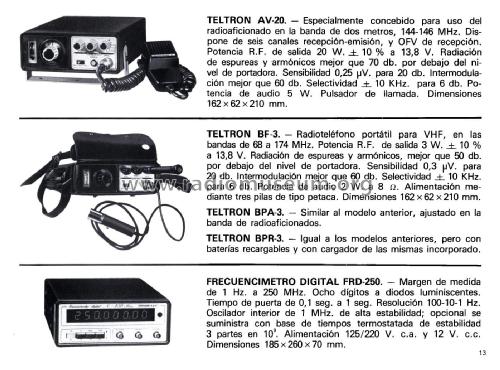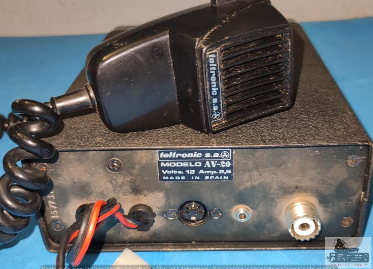 Teltronic AV-20 fabricación española, (Zaragoza) versión destinada al público amateur, 144-146 MHz con 6 canales por cristal de cuarzo tipo CR-78U en cápsula HC-25U y VFO en recepción.