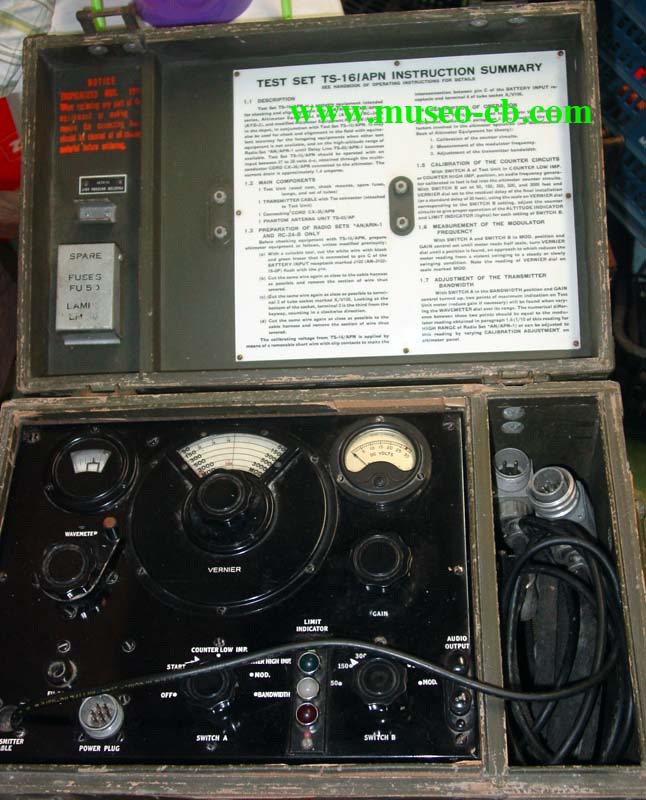 Caja UTILIZADa PARA CALIBRAR los ALTÍMETROs de los aviones estadounidensesde la segunda guerra mundial. Básicamente, el TS-16 consiste de un oscilador de audiofrecuencia de precisión y medidor de frecuencia UHF para la comprobación y la alineación de los altímetros FM. Cuando están conectados los cables de conexión, los circuitos contadores del altímetro se pueden calibrar. Es autónomo en caja de maderacon asa. Un compartimiento dentro de la caja se proporciona para almacenar el cordaje accesorio. La antena fantasma y fusibles de repuesto están montados dentro de la cubierta superior de la unidad de prueba. La frecuencia de trabajo es de 410 a 470 Megaciclos