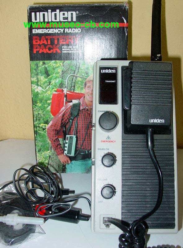 Emisora portátil. Incorpora un departamento para pilas, conexión al mechero del coche, antena de goma, correa para colgar y micrófono con soporte.
