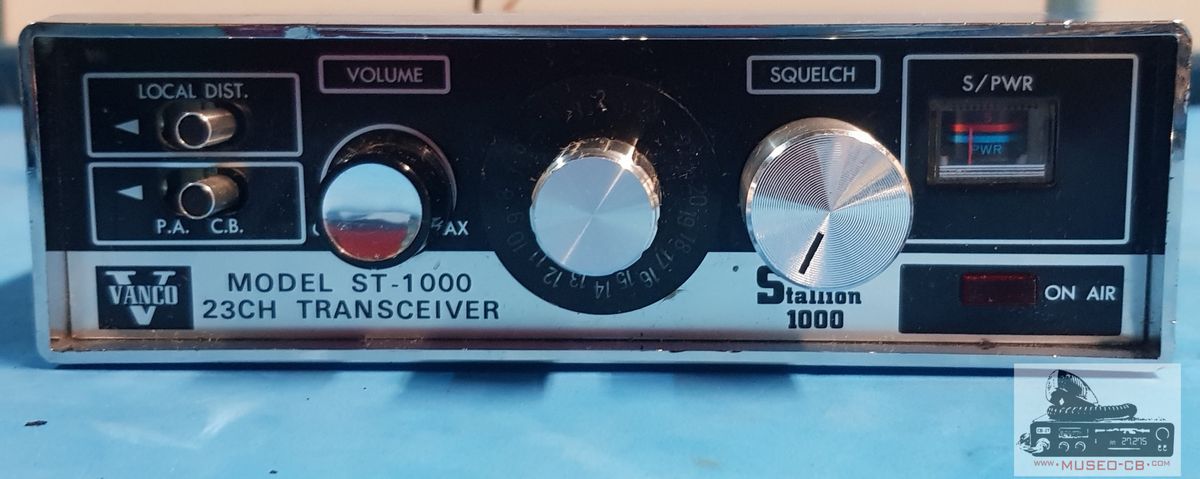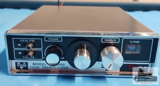 Emisora de 23 canales, con botón de local y DX, pequeño s-meter e indicador (luz roja) de transmisión.