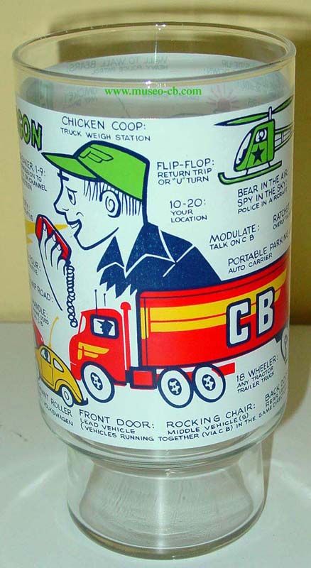 Gran vaso o jarrón, en fin recipiente de cristal decorado con motivos de la CB. Incluye la descripción de la jerga USA de CB.
